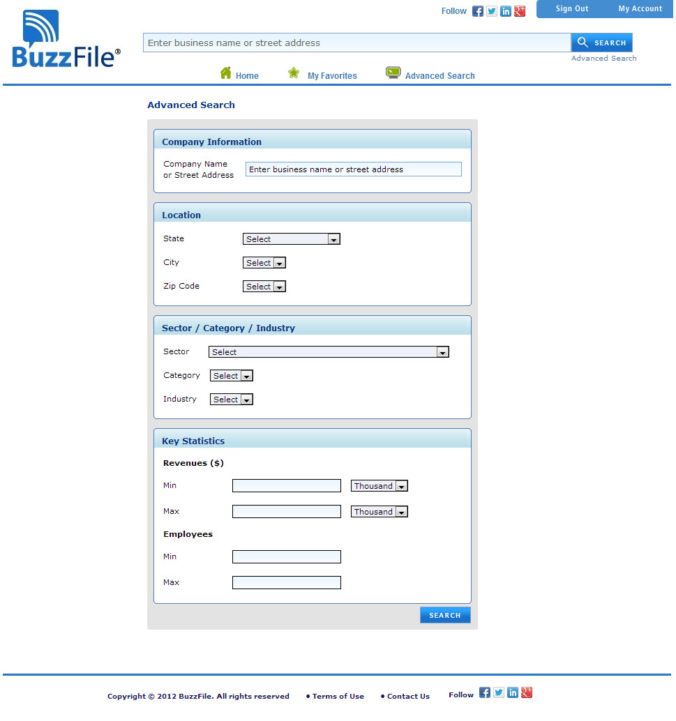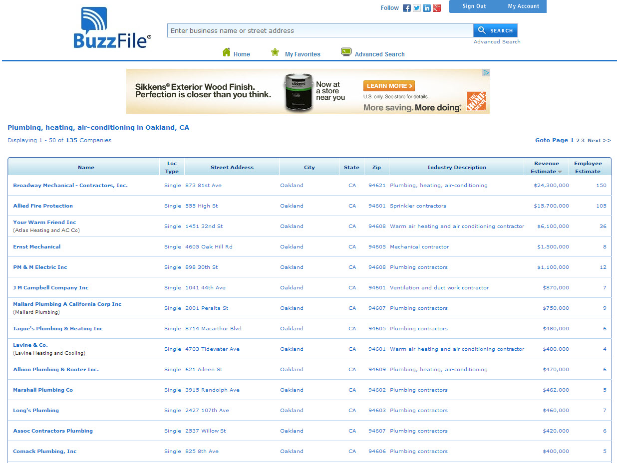 BuzzFile.com is a business directory with free information on 21 million companies in 18,000 industries.  Users can search for companies by name, address, industry, revenue or employees.  Users can sort or filter results by any column or field.